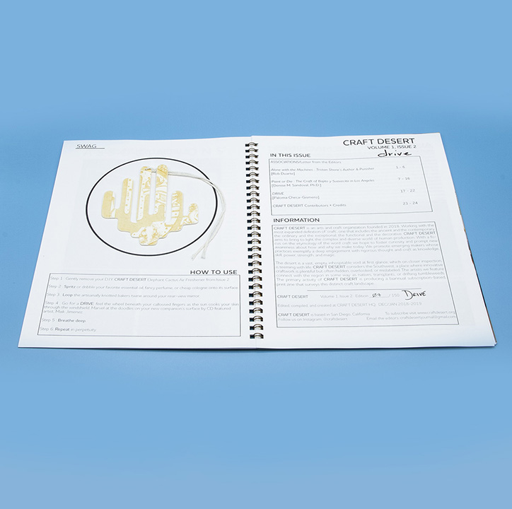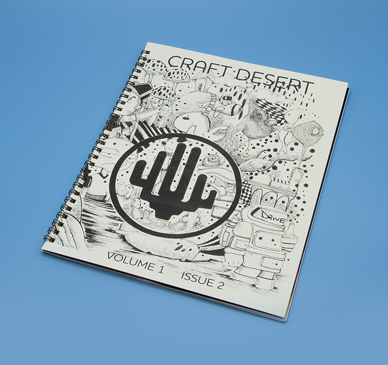 The co-founders of CRAFT DESERT, Adam and Kerianne, thank you for reading and encourage you to keep telling your friends to check out the publication. Issue 2, like issue 1, was assembled, printed, and coil bound by hand with the assistance of Christian Límon, an energetic and enthusiastic art student at SDSU.