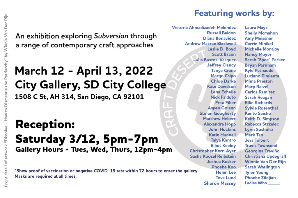 Small Acts: the Craft of Subversion, was a 65-person exhibition, mounted in the Spring of 2022, looking at the work of craft-based artists from across North America, as they addressed the potential for small acts of resistance and subversion to have a larger impact. Works addressed a range of sociopolitical, interpersonal, and economic issues, among many other topics, and spanned numerous media and practices. Below is a video walkthrough of the exhibition and show card, including a list of the artists who were included in the national open, juried, call.